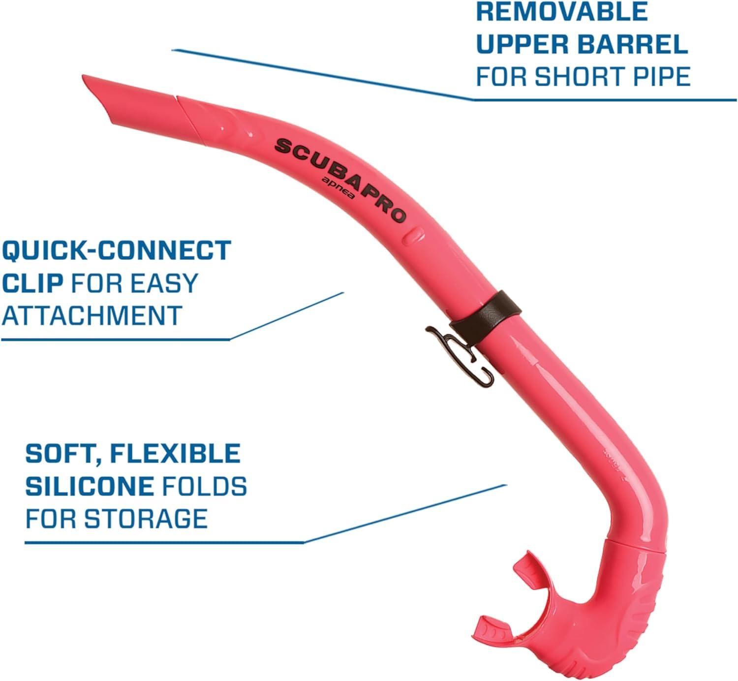 SCUBAPRO's Apnea or Freediving snorkel easily attaches to your mask strap when being used. When not needed, it can be folded and stowed in an accessory pocket. When it's time to do some surface swimming, it pops right back into shape. Without question, this is a versatile and easy-to-use surface breather.