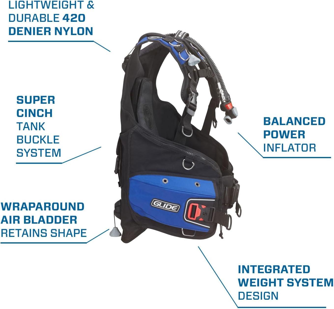Restyled for 2023, the Glide is a full-featured, front-adjustable BCD designed to maximize ease of use, fit and performance. This model offers new larger cargo pockets, a new integrated weight system design, upgraded backpack padding and a striking new blue color scheme. Among the features carried over is the Super Cinch tank buckle system and the Glide’s innovative Y-Fit shoulder design that adapts to the body better to allow for excellent control and range of motion for arms. A stainless steel triangular ring manages the forces in the Y’s center, balancing pressure over the body and keeping the harness under control for the ultimate in comfort at depth and on the surface. The dump system includes three new-generation valves that allow you to deflate the wraparound bladder in any swimming position.