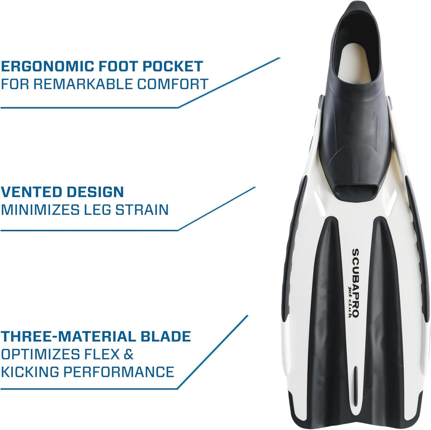Lightweight and comfortable, the Jet Club fin features a big, slightly stiff three-material blade that generates propulsive kicking power.