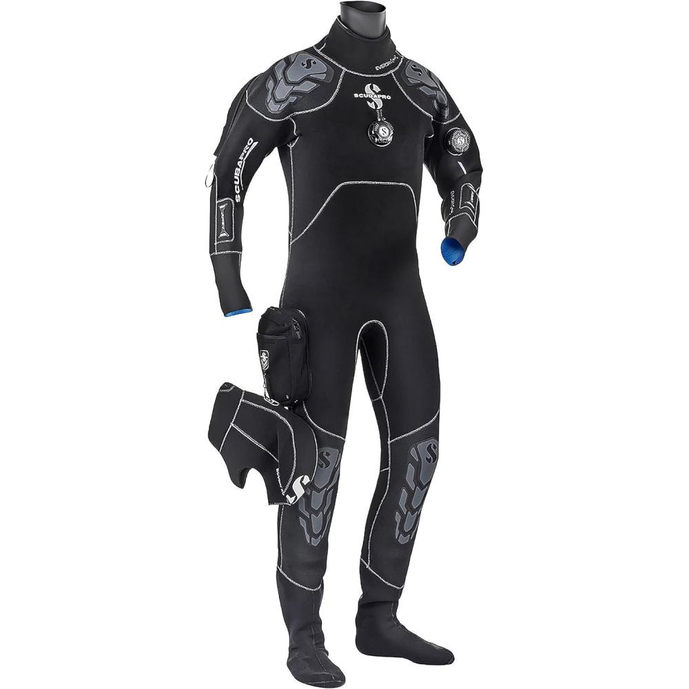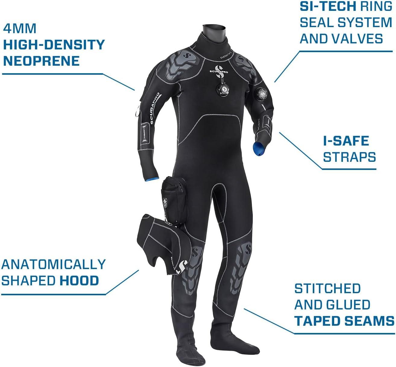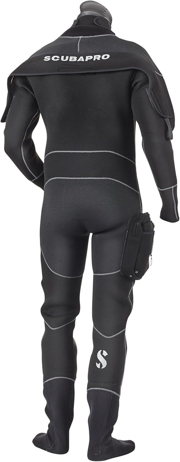 The premium-plus SCUBAPRO Everdry 4 mm Compressed Neoprene Drysuit offers the streamlined fit, comfort, and flexibility of a wetsuit with the thermal properties and water tightness of a drysuit. Made of 4 mm high-density neoprene, the Everdry weighs 50 percent less and is significantly softer than traditional drysuit neoprene. The neoprene resists compression at depth so the drysuit can be worn with a thin undergarment or no undergarment at all. SCUBAPRO's Si-Tech balanced side-activated inlet and adjustable outlet valves allow for pinpoint buoyancy control, increasing your stability and control at depth. Keep cold water out and body heat in in with features like a smooth-skin fold-under neoprene neck seal, ultra-smooth wrist seals, and a warm gray plush interior. Driven to constantly innovate and improve the diving experience, SCUBAPRO builds high-quality equipment for the work, sport, and lifestyle of people whose passion is found below the surface. Includes handy right-thigh utility pocket with D-ring, bungee, and zippered closure; comes with carrying bag; weighs 8.5 pounds; one-year warranty.