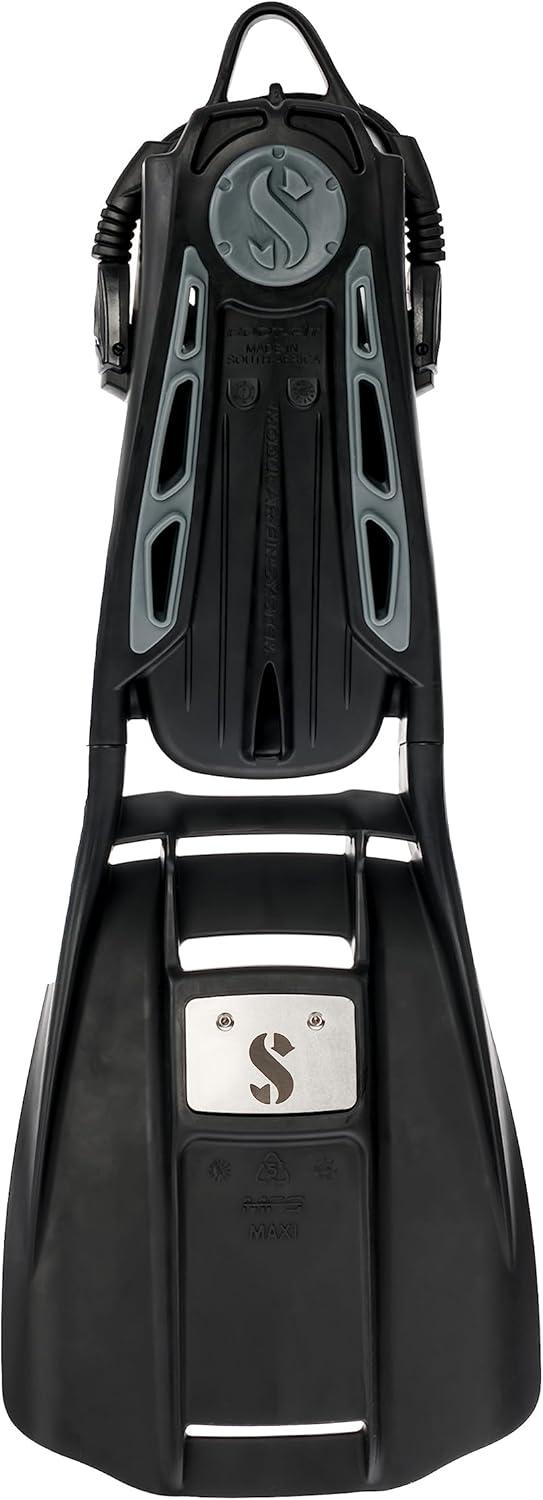 Available in black in 5 sizes (XS, S, M with Midi blades; L, XL with Maxi blades) and includes a Multi-Tool and 2 sets of Lock Plates, a Stainless Steel Weight System and a SCUBAPRO boat bag.