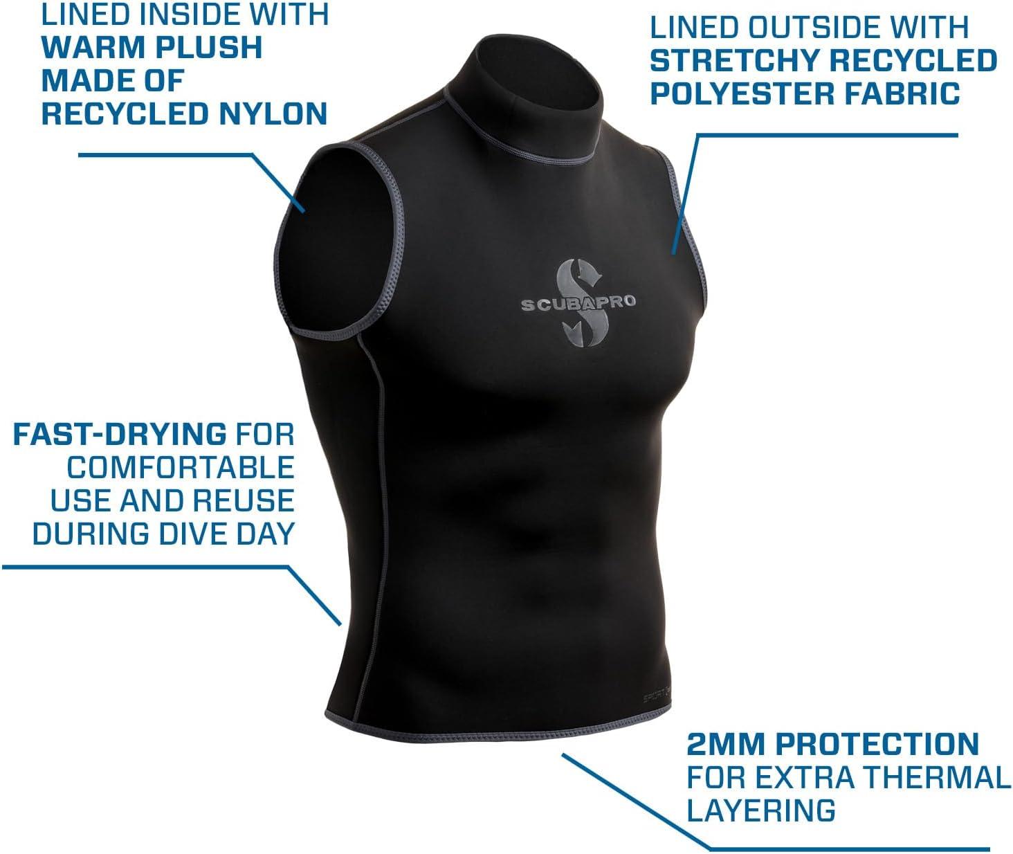 Designed to layer with any SCUBAPRO steamer, this classic 2mm Hoodless Vest is made of 2mm limestone-based pure neoprene, lined outside with stretchy recycled polyester fabric and lined inside with stretchy and warm plush made of recycled nylon. The Sport 2mm Hoodless Vest features dark logos on the chest and spine for that modern look, and is intended to cover the torso to protect the body’s thermal area. Flexible and comfortable, it's the perfect thermal addition for those times when extra thermal layering is the plan for the dive day.