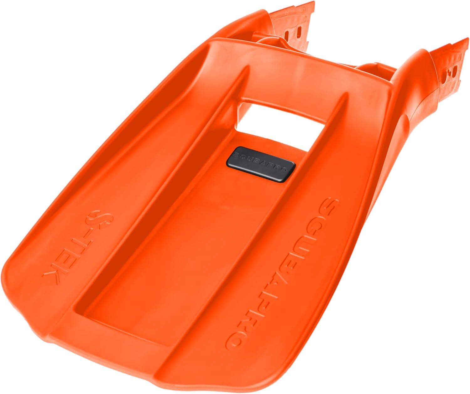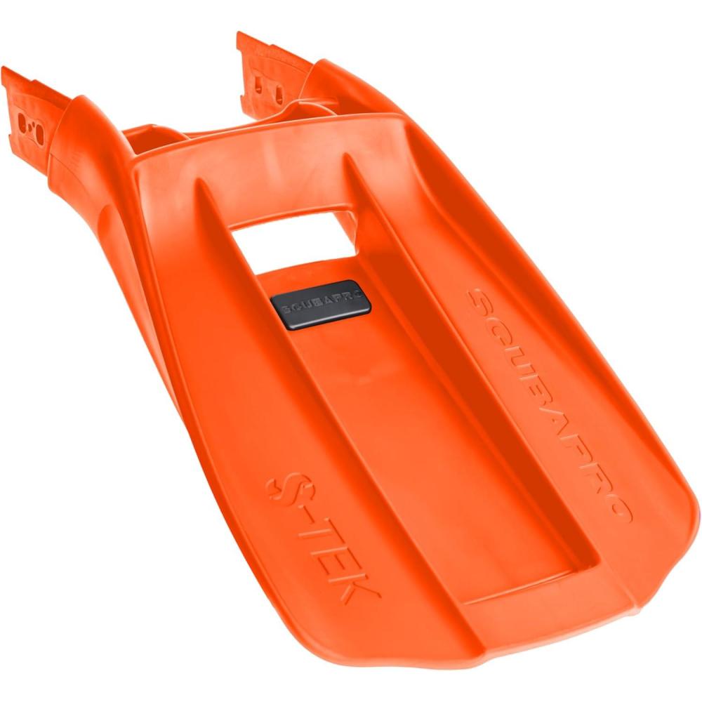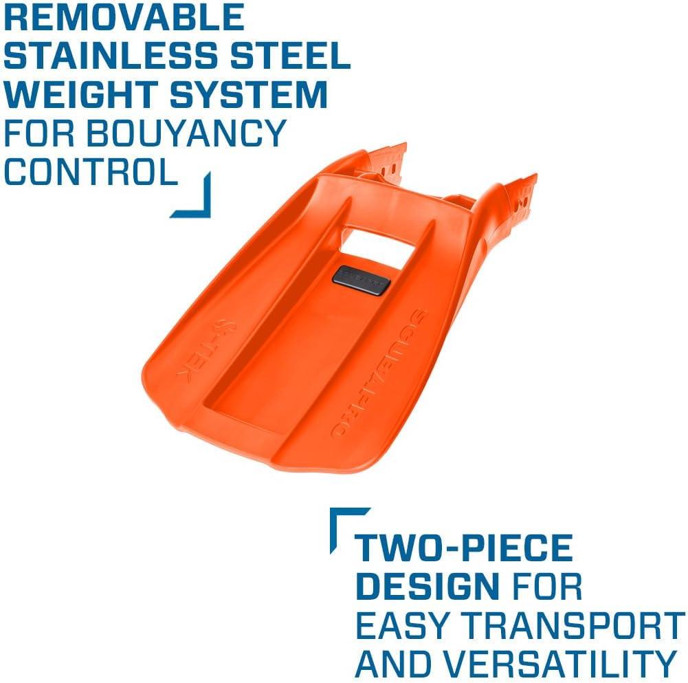 Introducing the ScubaPro S-Tek Pro Blade Modular Fin System, a next-generation fin designed specifically for technical diving. Constructed from durable Monprene for strength and designed with an ultra-slim profile, the S-Tek fins' 30 pre-angled blade requires less flex to achieve the desired angle of attack for efficient kicking. This makes the blade stiffer without increasing friction, reducing the risk of leg cramps and ankle fatigue while offering unparalleled maneuverability and high-performance alternating kicking. The two-part design, characterized by separately made shovel and foot pocket, makes it easy to carry. The blade and the foot pocket are made separately and joined with the robust Socket-Lock Connecting System, which facilitates assembly and disassembly operations. The removable stainless steel plate weight system allows you to choose between positive, neutral or negative buoyancy fins. Compatible with Seawing Supernova liners. The product weighs 2.86601 lbs, available in size L-XL and color Orange. The package includes S-Tek Shovel, MFS Multi Tool, 1 set of locking pins, Stainless Steel Plate Weight System and 1 SCUBAPRO Boat Bag.