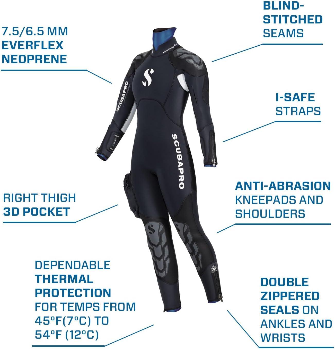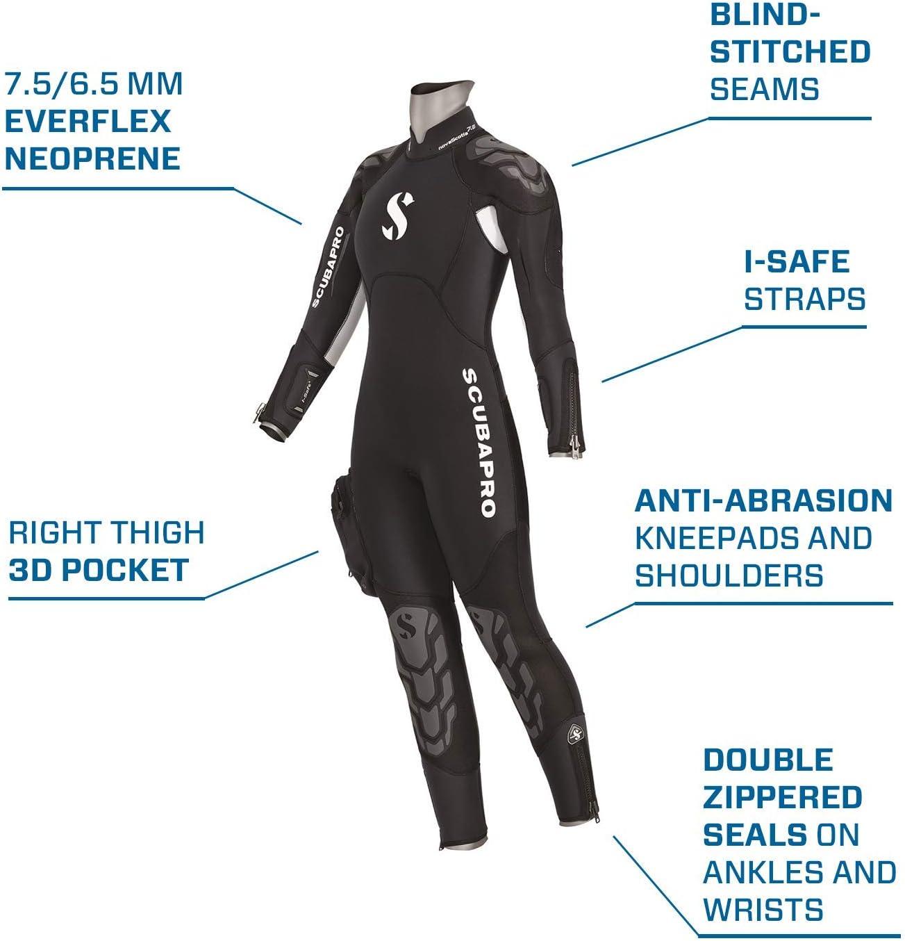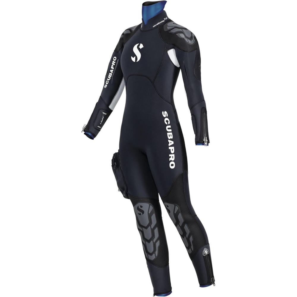 A snug-fitting, flexible dive suit with good thermal properties and minimal water intrusion, the women's NovaScotia Steamer with included hood keeps you very warm and relatively dry while exploring the depths. Made from 100% Everflex X-Foam neoprene for comfort and durability, the wetsuit features blind-stitched seams that block water entry and double-zippered seals on ankles and wrists with KA brass sliders for water-tightness. Internal stress discs installed at stitch intersections protect seams, extending the suit’s working life. Suits are assembled using a solvent-free glue — a 100% green process — and the glued and blind-stitched seams keep warmth in and water out. Positioned between a traditional wetsuit and a neoprene drysuit, the NovaScotia offers a plush interior liner in the arms, legs, and shoulder areas for increased warmth and stretch, plus an ultra-comfortable fold-under neck seal. Shoulders and kneepads feature both anti-abrasion patterns and extra rubber prints for added protection and an enhanced spine pad provides cushioning where the tank hits the diver's back. Certified as A Class a dive suit, the NovaScotia Steamer 7.5mm wetsuit is rated for water temperatures from 45 to 54 degrees F (7 to 12 degrees C). Driven to constantly innovate and improve the diving experience, SCUBAPRO builds flawless equipment for the work, sport, and lifestyle of people whose passion is found below the surface.