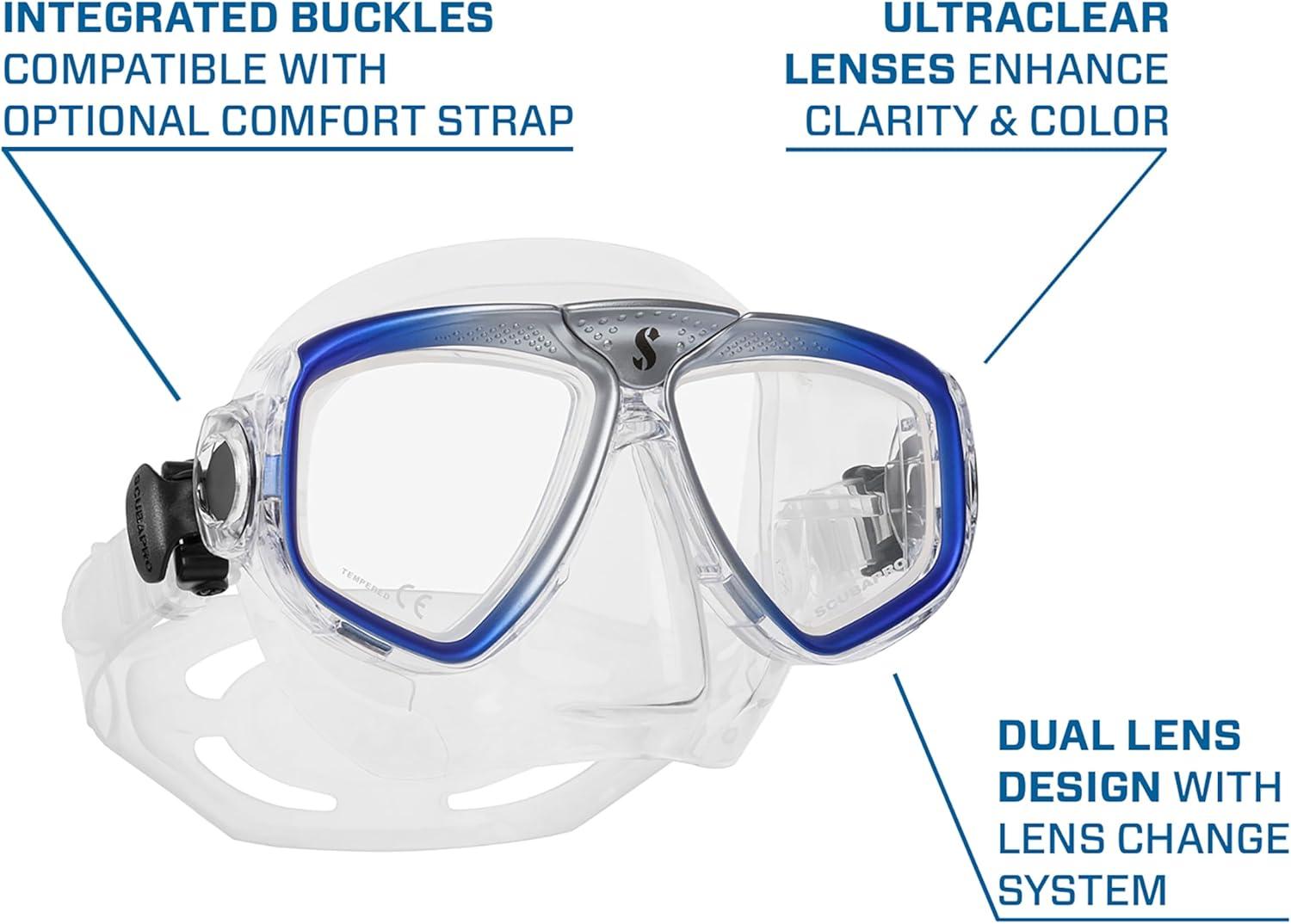 Universal fit ensures a comfortable, watertight fit with integrated buckles to make adjustments easy. Equipped with a standard silicone strap, but compatible with the comfort strap or neoprene mask strap accessory.